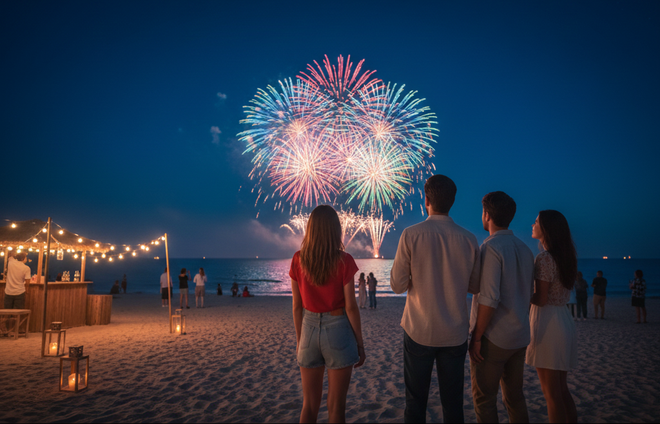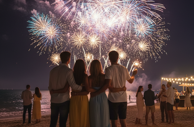 Fotos de costas olhando os fogos, pessoas andando na praia ou conversando em rodas rendem imagens naturais e cheias de significado.