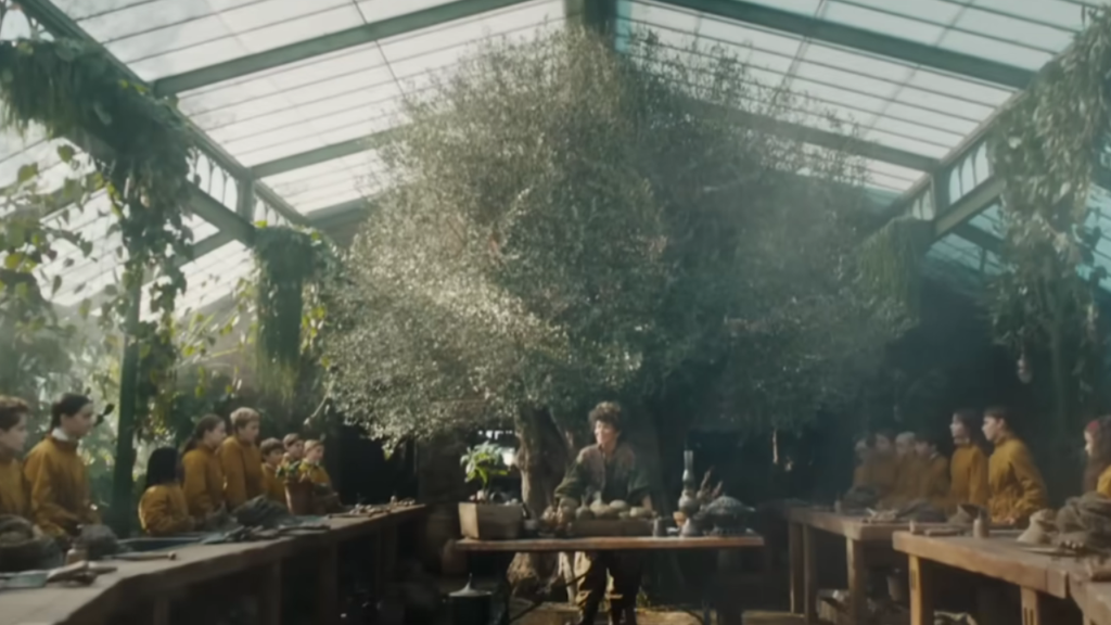 A cena é breve, mas dá para notar os alunos durante a disciplina ministrada pela Professora Sprout, iniciando um evento que será bastante importante no segundo ano pelo famoso caso das mandrágoras.