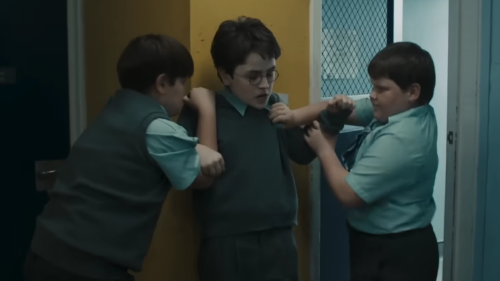 Maltratado pelos tios, os Dursley, Harry também não tinha paz nos corredores da escola trouxa, algo que não aparece nos filmes e que deve marcar presença na série da HBO com base no que vimos no trailer.