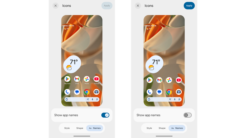 Remover nomes de apps da tela inicial