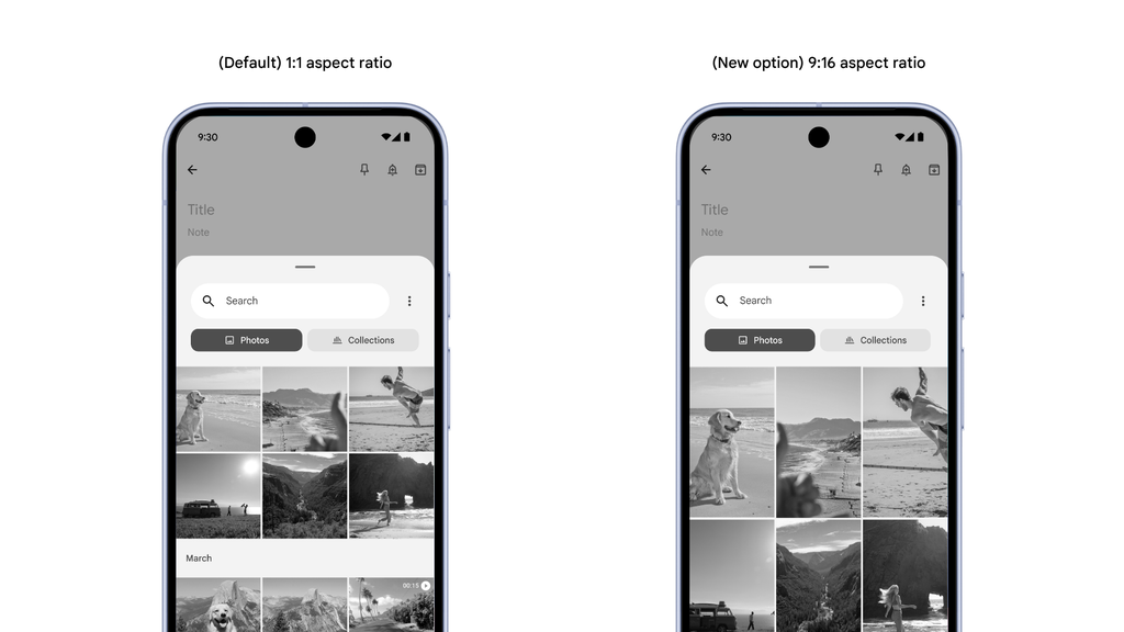 A tela de seleção de fotos do Android vai ganhar uma opção para mostrar as miniaturas no formato 9:16. O ajuste, opcional para desenvolvedores, permite ter uma noção melhor das imagens que serão escolhidas, já que muitas fotos para redes sociais são tiradas no formato vertical.