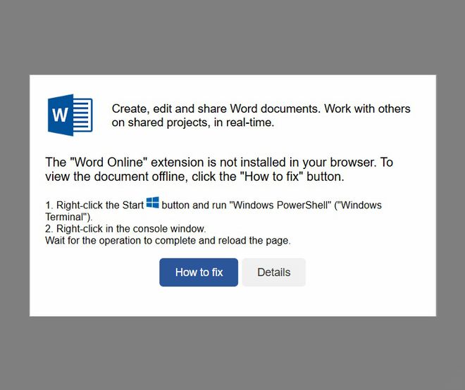 Na prática, o alerta comprometido simula um falso sumiço de uma extensão online do Word, solicitando ao usuário para que ele solucione o problema clicando em um botão de “como corrigir”. Dessa forma, o aviso promete que a pessoa conseguirá visualizar o documento em questão.