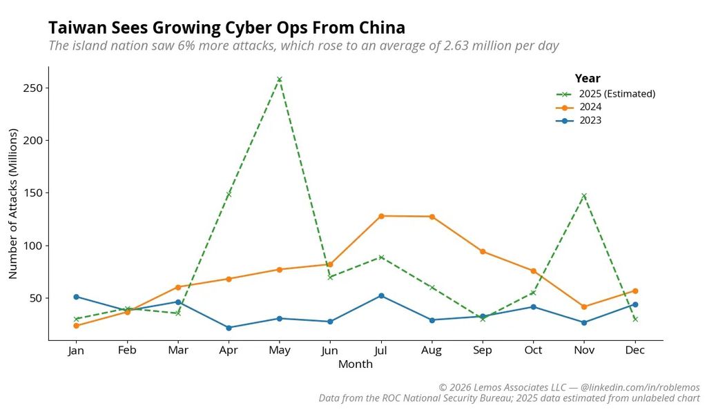 A China aumentou suas investidas contra Taiwan no ambiente digital em 2025: segundo relatório do National Security Bureau (NSB), os ataques de grupos de ciberameaças chineses contra infraestruturas taiwanesas cresceram 6% em relação ao ano anterior.