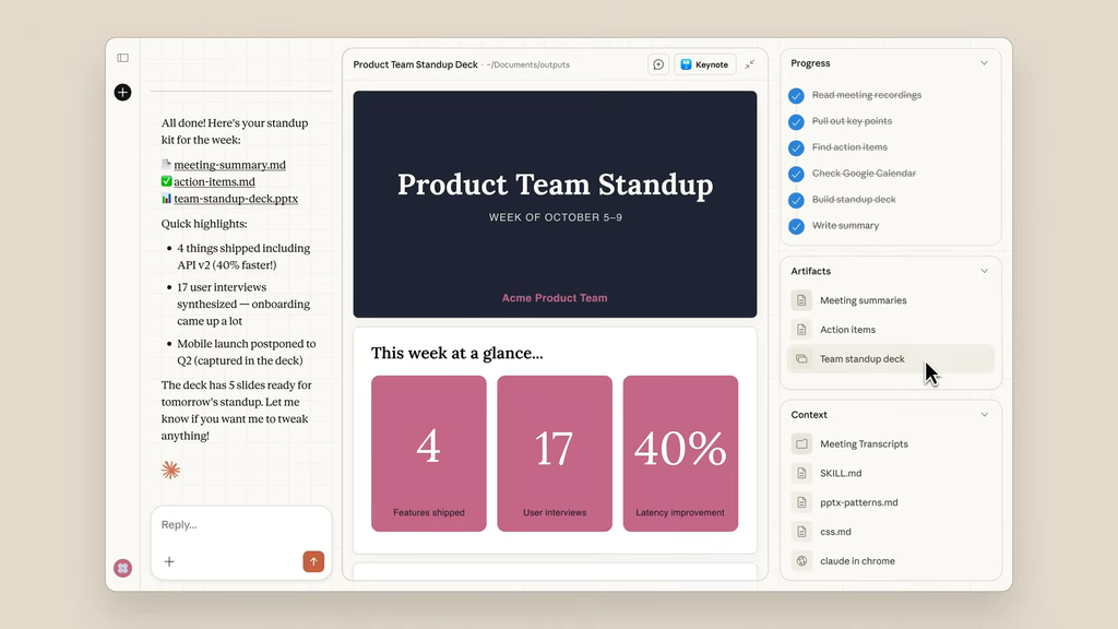 O Cowork atua como um assistente de IA com acesso a todas as pastas e arquivos do computador de cada pessoa. É possível pedir para a ferramenta atuar com base em documentos específicos, como uma pasta de transcrições ou planilhas de resultados, no lugar de uma abordagem geral.