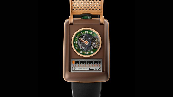 Já os minutos aparecem em um mostrador circular central feito de cristal de safira. O uso de molas de balanço duplas e opostas estabiliza o movimento da roda de balanço, o que promete aumentar a precisão e a estabilidade do conjunto.