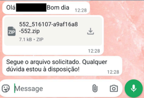 A análise da Acronis detectou que o ataque começa quando a vítima recebe uma mensagem no WhatsApp que contém um arquivo ZIP malicioso. O texto enviado impressionou os pesquisadores pelo nível de engenharia social utilizado, trazendo uma linguagem casual e convidativa para criar um vínculo de confiança, como “segue o arquivo solicitado” e “qualquer dúvida, estou à disposição”.