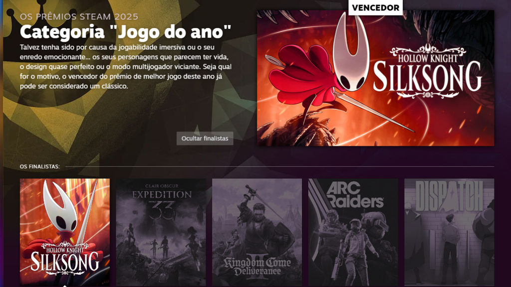 Além de levar o GOTY para casa no Steam Awards 2025, Hollow Knight: Silksong também venceu na categoria "Melhor Jogo que Você Joga Mal", compatível com sua dificuldade brutal. Clair Obscur: Expedition 33 não ficou de fora e foi eleito como a Melhor Trilha Sonora do ano. Jogos esnobados no The Game Awards 2025, como Dispatch e Silent Hill f, conquistaram os prêmios de Trama Excepcional e Estilo Visual Excepcional.