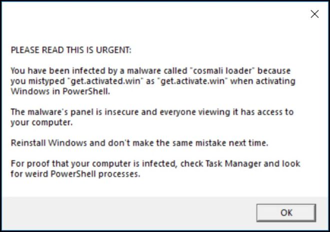 O alerta afirma que o malware foi implantado após a digitação incorreta do comando “get.activated.win” na hora de ativar o Windows no PowerShell. O erro está na troca por “get.activate[.]win”, um comando falso usado pelos criminosos para enganar os usuários que não percebem o erro no domínio.