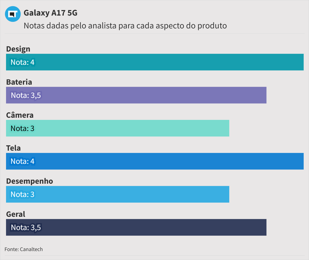 "Um dos maiores destaques do Galaxy A17 5G é sua tela. Com painel Super AMOLED, ele se destaca bem contra a concorrência, que geralmente aposta em displays IPS LCD ou equivalentes" — Bruno Bertonzin