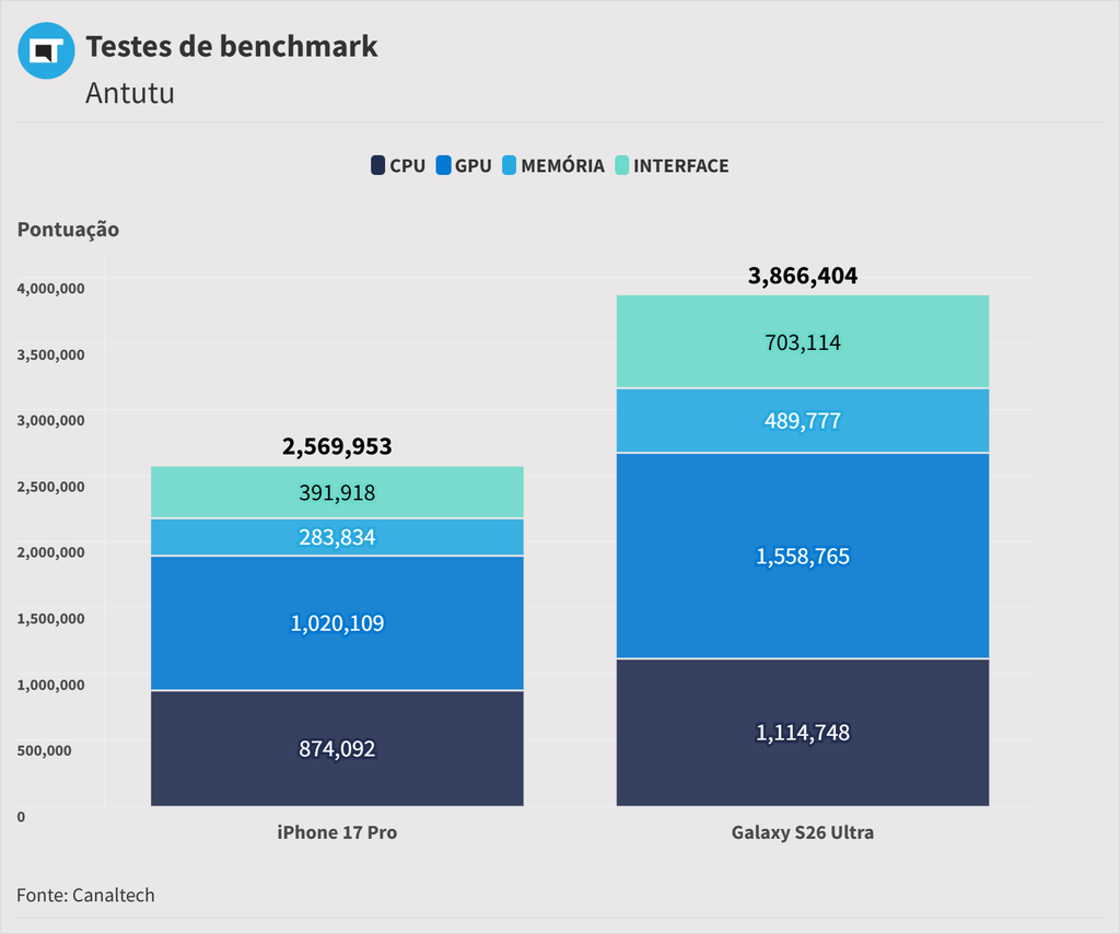 Essa diferença impacta bastante em benchmark. No teste do AnTuTu, a unidade do Galaxy S26 Ultra que testamos superou 3,8 milhões de pontos, enquanto o iPhone anotou 2,5 milhões na mesma plataforma.