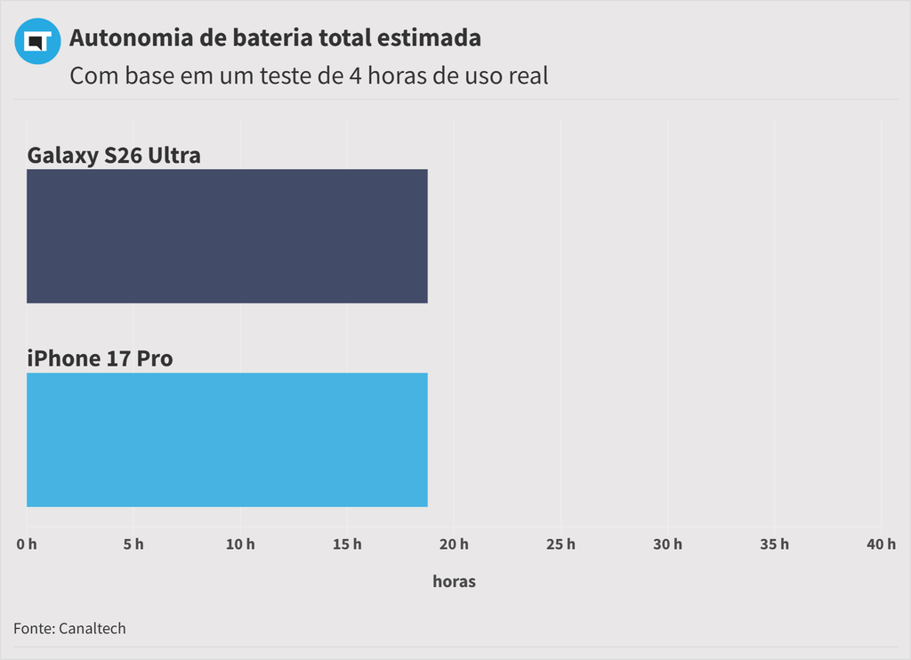 Já o iPhone suporta 40 W, mas não traz carregador na caixa. No modelo da Maçã, o tempo de carga total chega a 1h15.