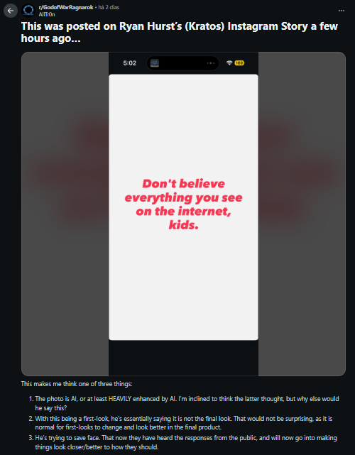 Como resposta, o intérprete de Kratos publicou uma mensagem em seus stories do Instagram, afirmando: “Não acreditem em tudo que veem na internet, crianças”.