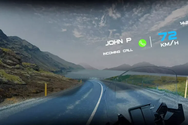 Resultado de uma parceria com a startup francesa EyeLights e a tecnologia de micro-OLED da Sony, o sistema do capacete projeta informações como velocidade, instruções de navegação GPS e até chamadas telefônicas no campo de visão do condutor, que as vê como estivessem flutuando à sua frente.
