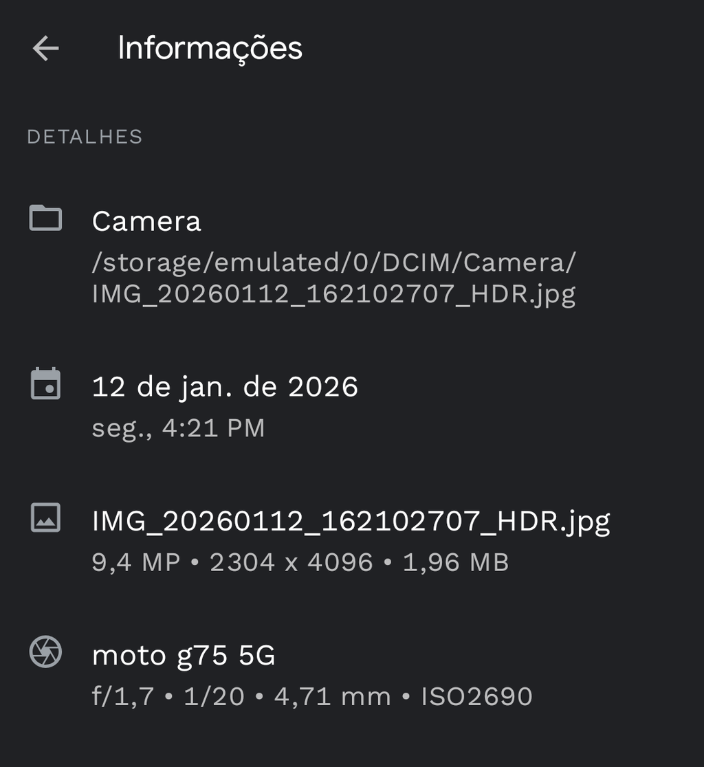 - Clique na aba “Detalhes”, onde será possível ver uma lista com todas as informações capturadas por metadados, como localização, câmera e modelo.