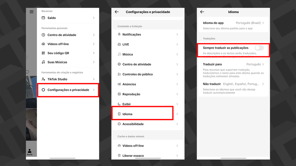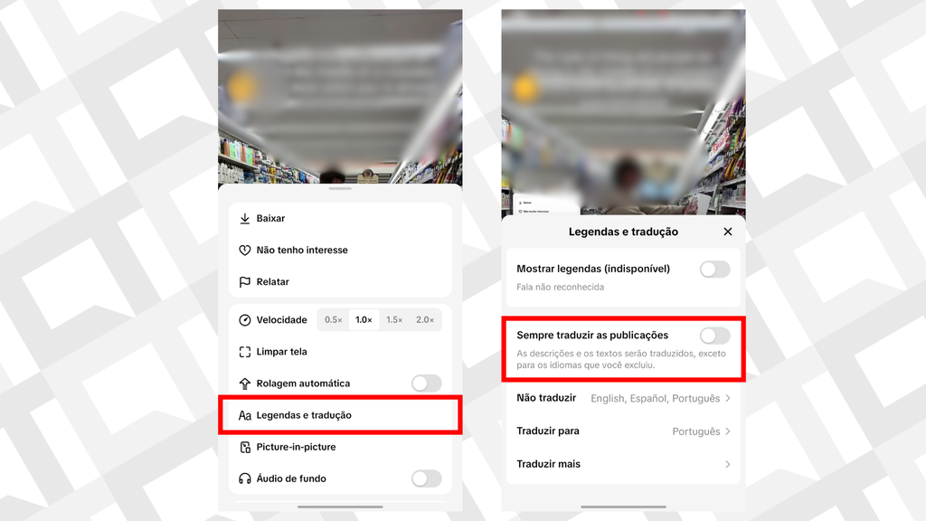 A primeira opção envolve desativar recursos de tradução quando o vídeo aparece no feed. Saiba como: