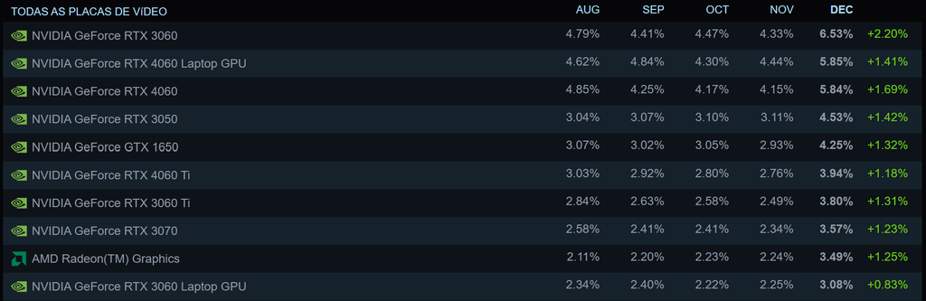 E falando nisso, curiosamente, a pesquisa de hardware do Steam mais recente, referente ao mês de dezembro de 2025, mostra a GPU Ampere mainstream da NVIDIA de volta ao topo depois de crescer 2,20%. Mesmo com a RTX 4060 mobile e desktop aumentando sua participação em cerca de 1,50%, isso não foi o suficiente para impedir o avanço da RTX 3060.