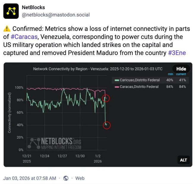 Segundo o Dark Reading, a rede de monitoramento NetBlocks chegou a registrar uma perda de conexão da internet em algumas partes da capital venezuelana no momento em que a operação estadunidense acontecia no país, com cortes de energia. Contudo, Alp Toker, diretor da plataforma de análise, afirmou que isso não quer dizer que um ciberataque tenha ocorrido de fato.