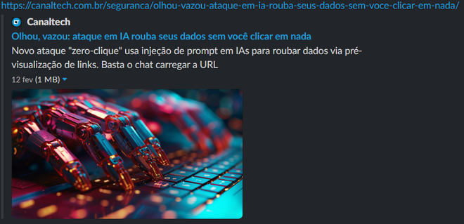 Assim que a inteligência artificial obedece, o aplicativo de mensagem visado verifica o link e, automaticamente, transforma a URL em um card interativo. Como o seu app já acessou o site comprometido para fazer a verificação do link, basta que você olhe para a mensagem para que seus dados sejam vazados.