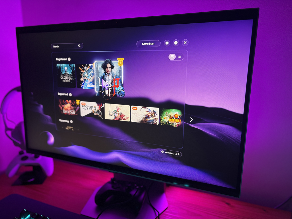Para começar, ao abrir o hub onde podemos ver os jogos 3D suportados, já temos uma demonstração, já que toda a interface é tridimensional. Nele, você já consegue ver a movimentação dos elementos ao mexer a cabeça por conta do "eye tracking" das câmeras do monitor. É algo que fotos e vídeo não captam, então só usando para se ter uma noção.