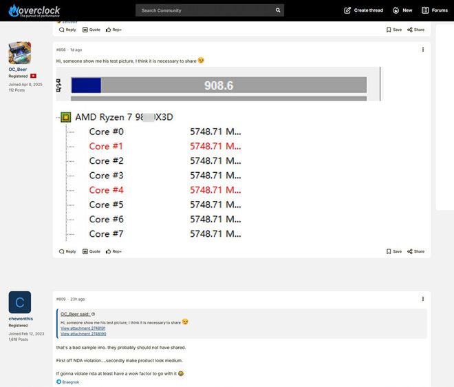 O print mostra um processador com nome apagado, possivelmente sendo o Ryzen 7 9850X3D, já que os clocks estabelecidos são muito altos para o 9800X3D (que tem boost de 5,2 GHz). Estamos falando de nada menos que 5,748 MHz, cerca de 150 MHz a mais do que o prometido pela AMD. E o mais interessante é que todos os 8 núcleos registraram essa frequência.