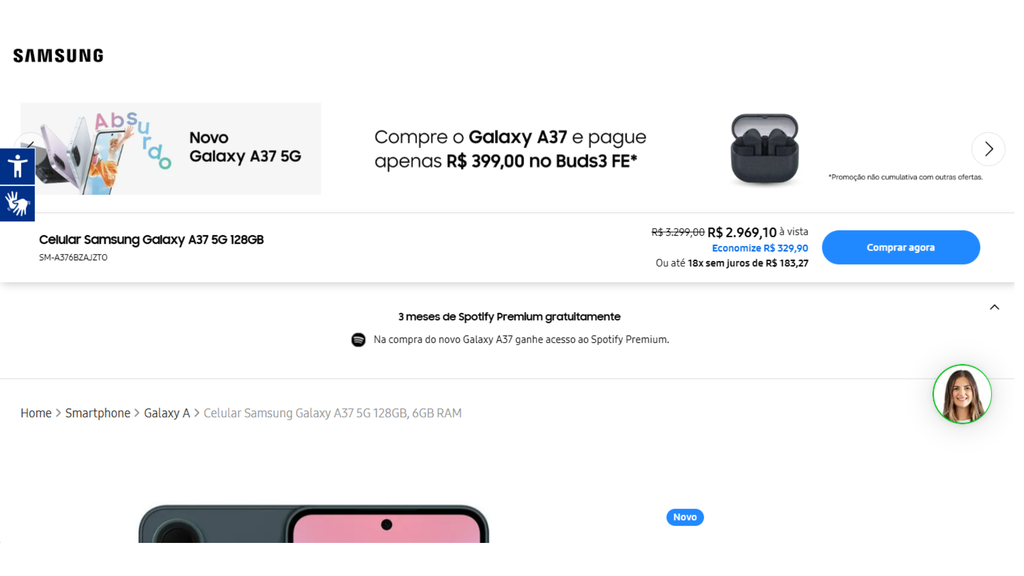 A loja oficial da Samsung no Brasil oferece uma vantagem para adquirir os novos intermediários da marca: quem comprar um modelo Galaxy A17, Galaxy A37 ou Galaxy A57 ganha três meses gratuitos de Spotify Premium para ouvir músicas e podcasts sem anúncios pelo celular.