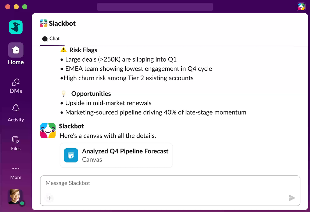Entre as funções disponíveis, a ferramenta pode analisar arquivos, criar rascunhos de novos projetos, resumir conversas e sugerir novos comandos com base na atividade recente. Tudo isso ocorre sem a necessidade de informar a IA manualmente — o bot consegue navegar por canais, mensagens diretas e arquivos para entender o que está acontecendo.