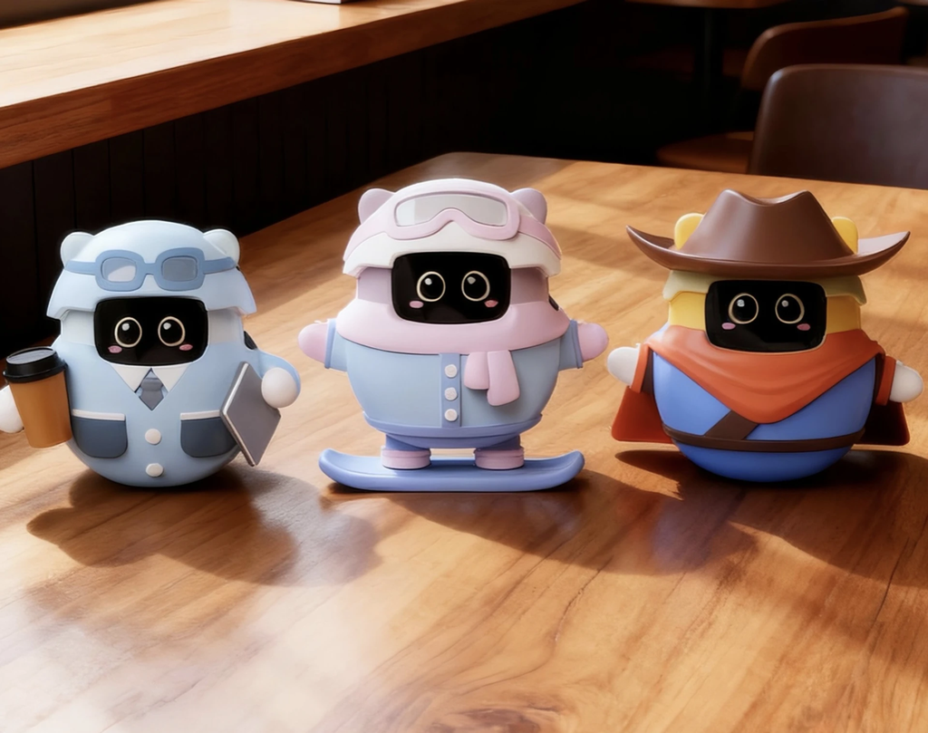 O aparelho estará disponível nas cores azul, rosa e amarelo. A personalização se estende ao personagem digital, com direito a acessórios e figurinos variados, incluindo roupinhas temáticas, como uma fantasia de cowboy.