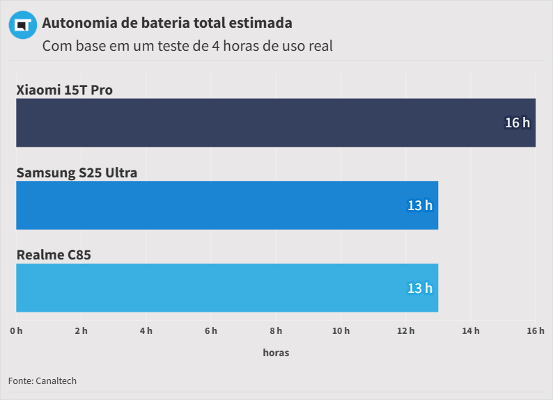 Em um teste padronizado de quatro horas, o celular consumiu 29% de carga sob atividades exigentes. Isso daria em média 13 horas de autonomia em uso contínuo e extremo.