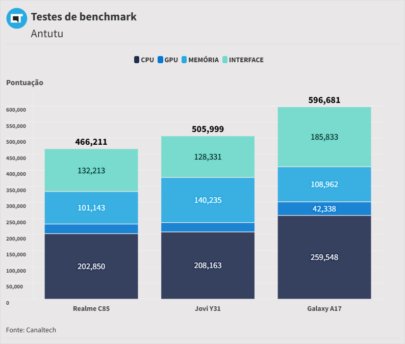Seu score no Antutu reforça: são apenas 466 mil pontos, ou seja: esse definitivamente não é um celular para jogos e tarefas pesadas. Ademais, é um aparelho funcional, mas longe de ser indicado para quem busca alto desempenho.