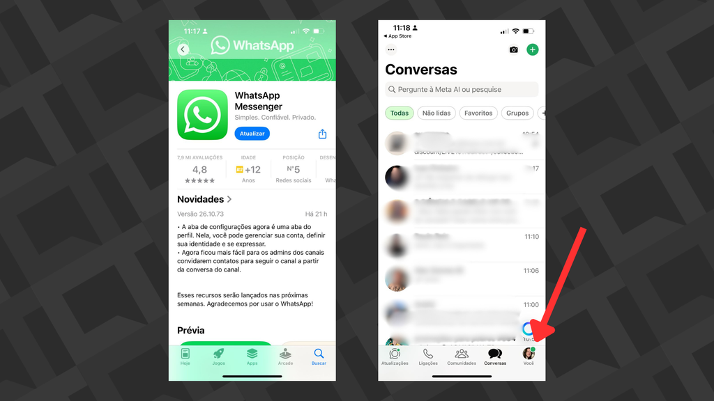 A atualização 26.10.73 do WhatsApp para iOS, liberada na segunda-feira (16), trouxe uma nova aba “Você” ao menu inferior do app. A mudança remove o antigo ícone de engrenagem e troca por um ícone com a foto de perfil da conta.