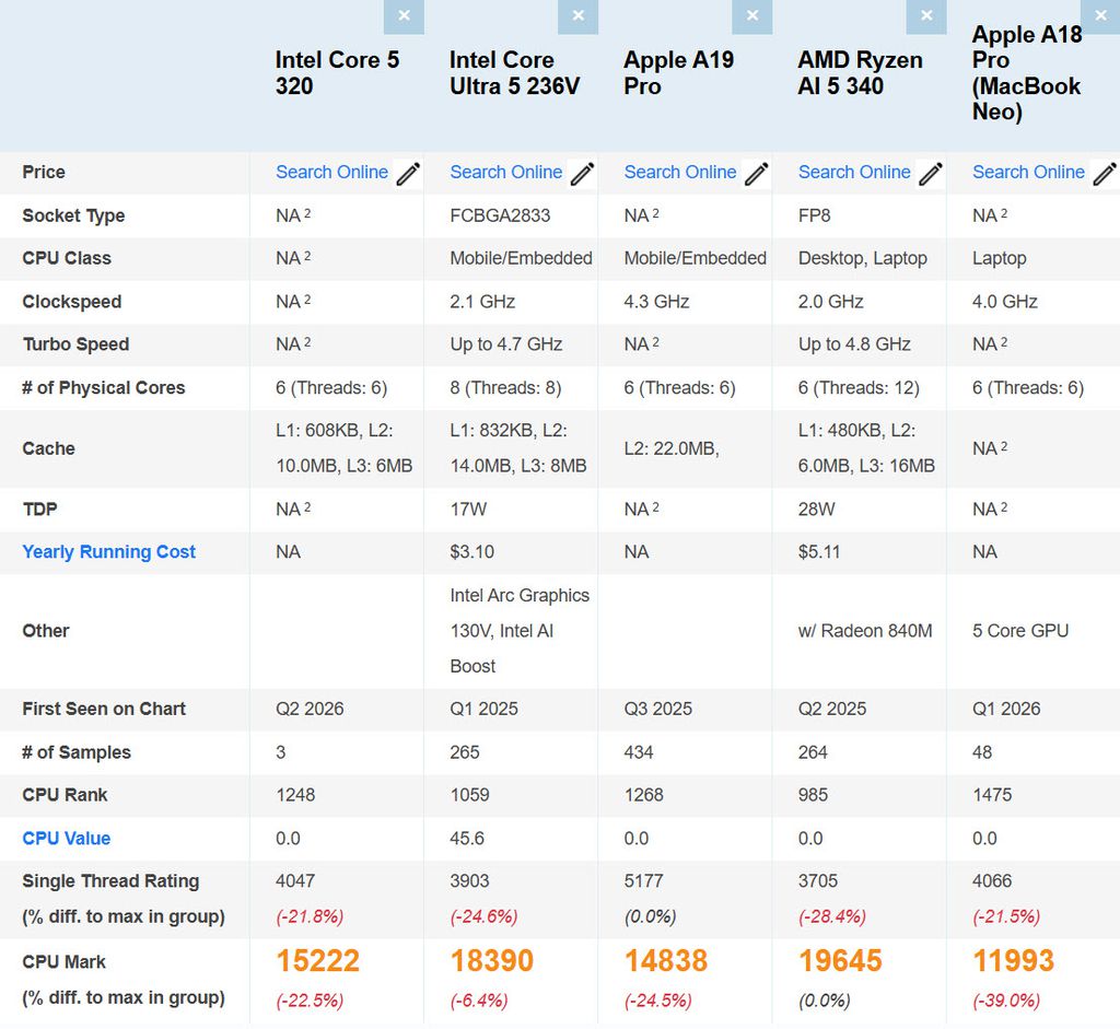 A Intel revelou recentemente novos processadores com foco em eficiência para notebooks. Chamados de Core Series 3 (Wildcat Lake), a série visa o lugar que o MacBook Neo tem ocupado. Um teste feito no PassMark com o Core 5 320 mostra que a CPU do Time Azul é 27% mais rápido em multi-thread, mesmo tendo a mesma quantidade de núcleos do chip do notebook da Apple, e empata em single-thread.