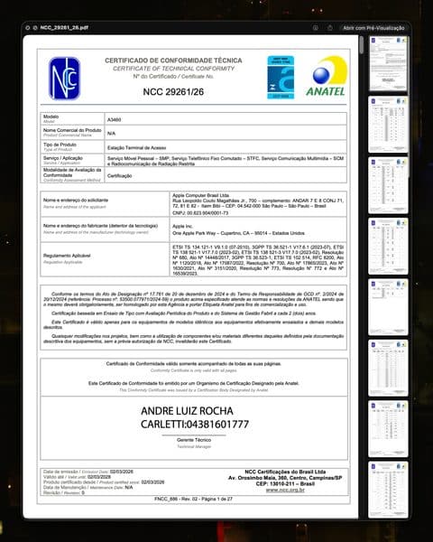 Eis o Certificado de Conformidade Técnica do laptop: