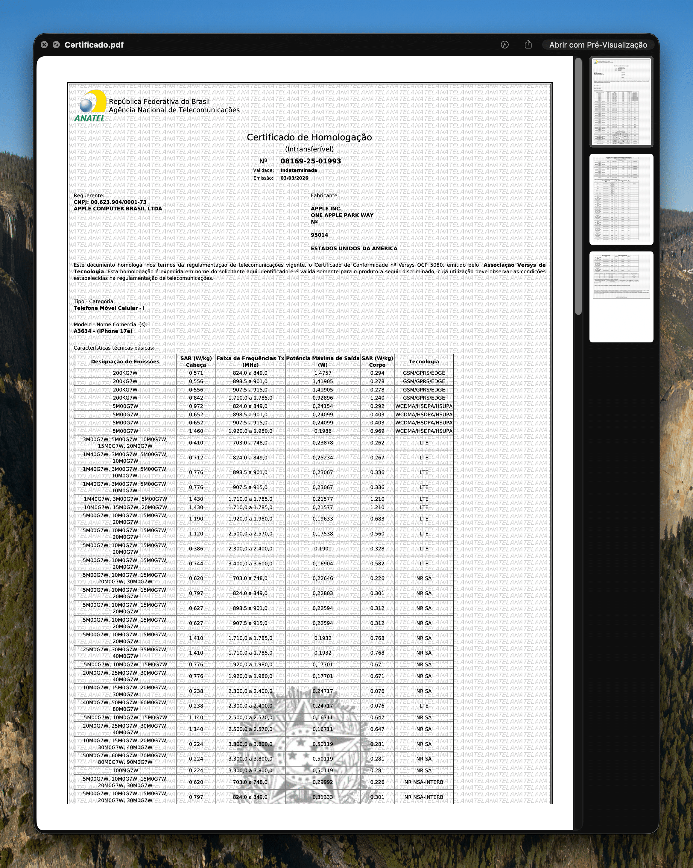Eis o Certificado de Homologação do iPhone 17e:
