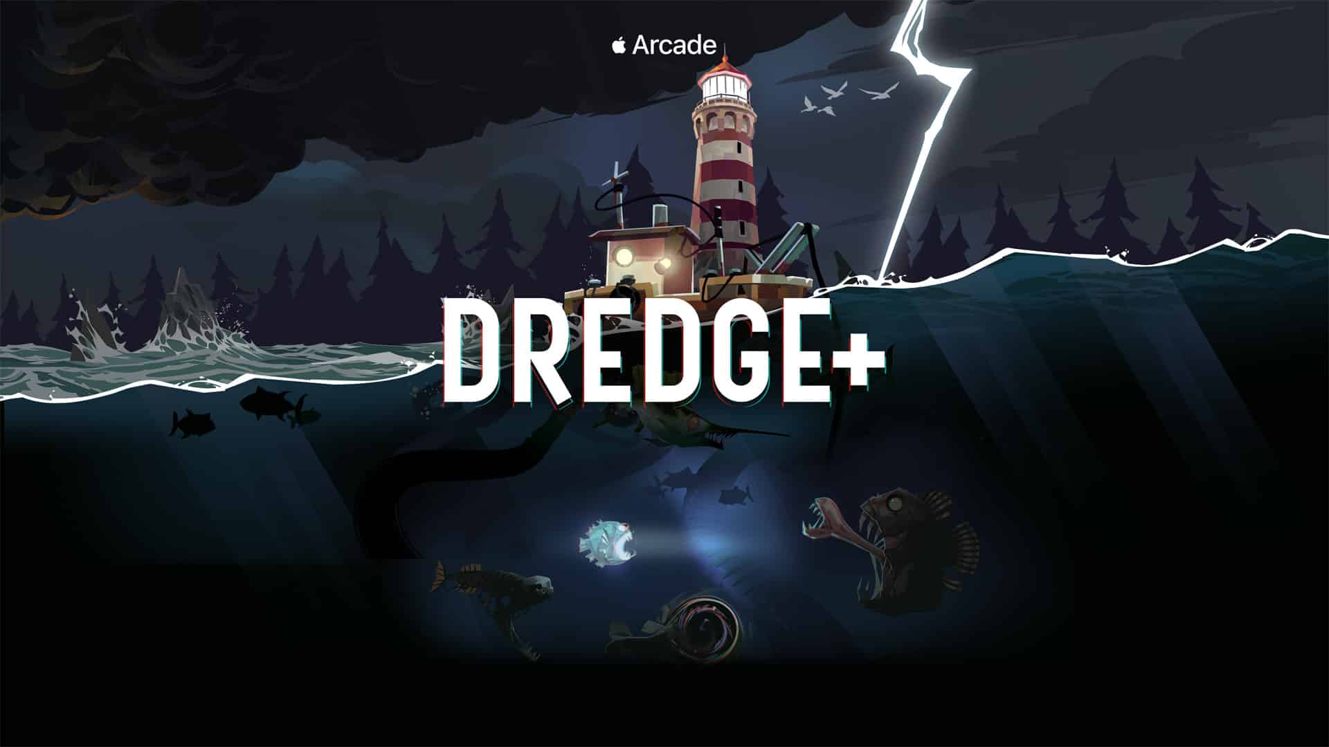 DREDGE+ é a versão para o Apple Arcade do jogo de survival horror da Black Salt Games, incluindo todo o conteúdo DLC 1 (The Pale Reach, The Iron Rig, Blackstone Key e a vara de pesca personalizada) bem como a campanha completa do título — na versão comum, apenas o primeiro capítulo é gratuito.