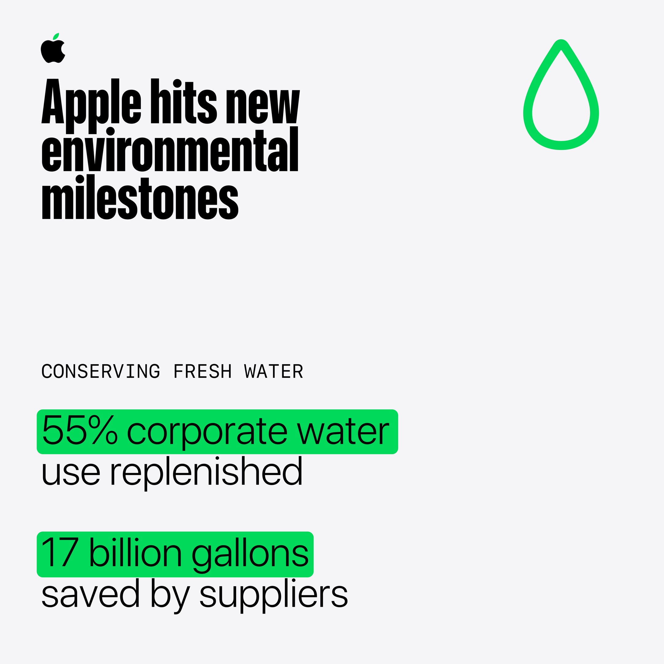 Quanto à utilização de recursos hídricos, a Apple e seus fornecedores desenvolveram um processo de anodização com reaproveitamento de até 70% da água. A Maçã afirmou que pretende expandir essa tecnologia para mais linhas de produção nos próximos anos.