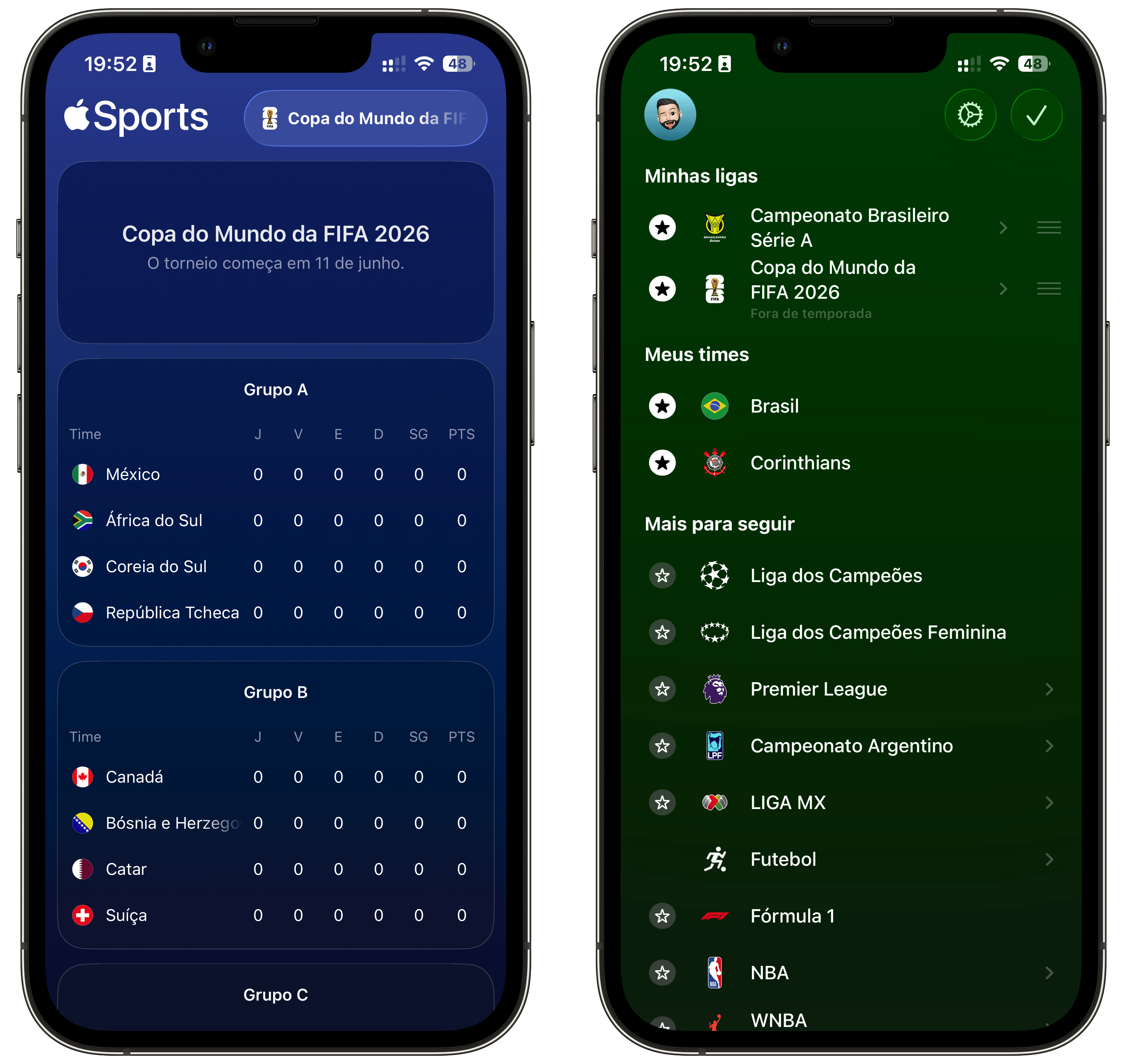 Fãs de futebol podem agora seguir a competição como um todo (embora o app destaque que a temporada ainda não está rolando), bem como acompanhar suas seleções favoritas direto no app.