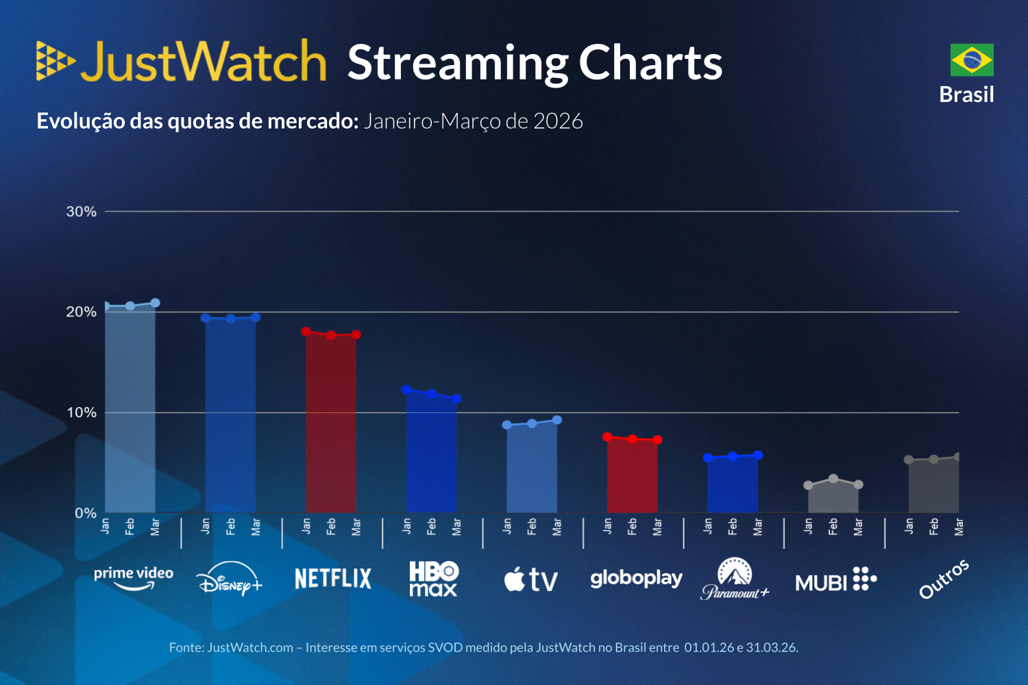 O JustWatch divulgou o seu tradicional relatório com dados referentes ao mercado brasileiro de streaming no primeiro trimestre de 2026 — e com um crescimento razoável do Apple TV em relação ao mesmo período do ano passado.