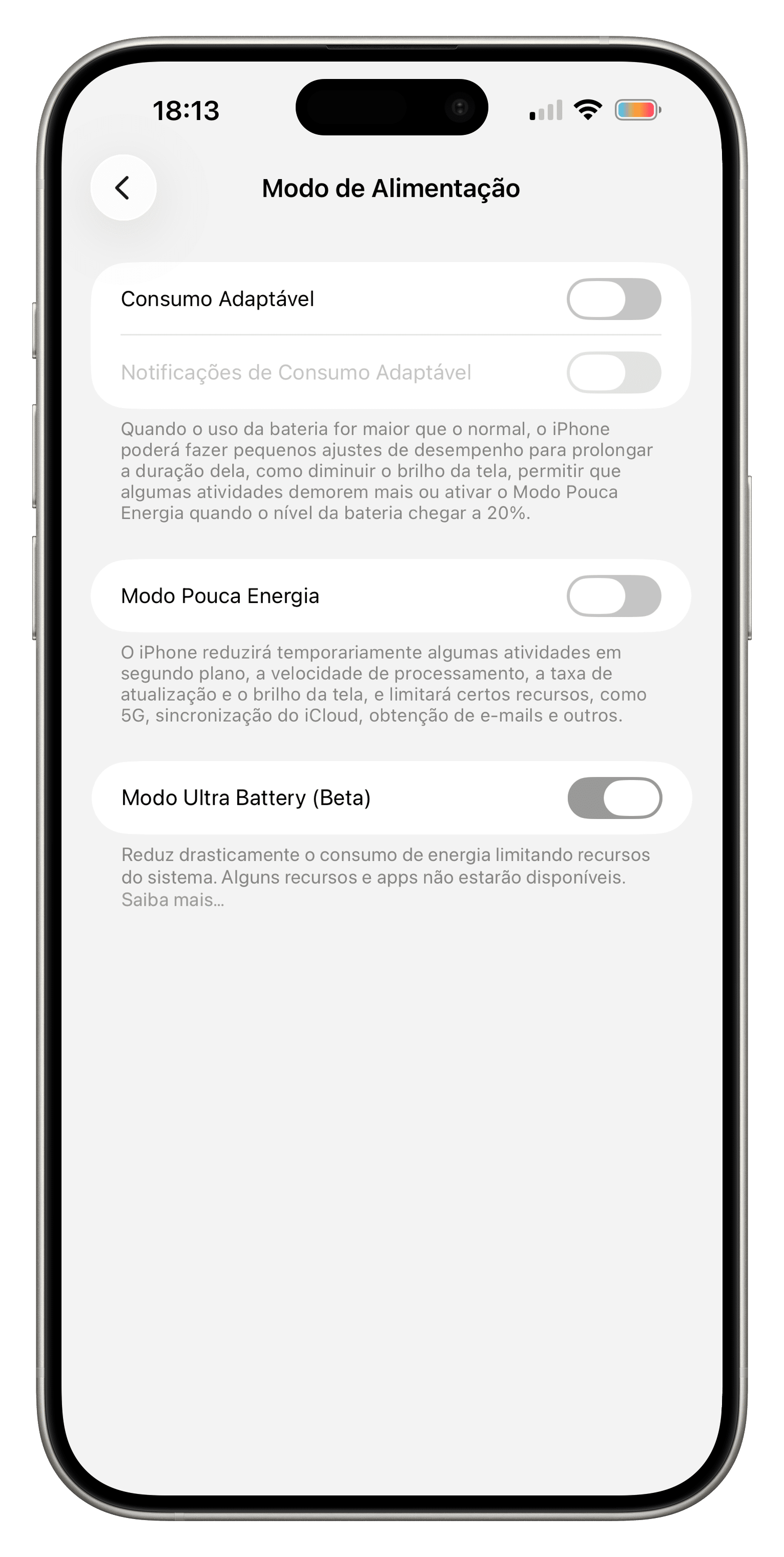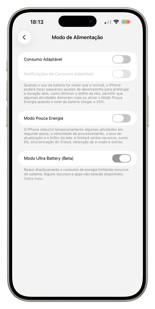 Embora ainda marcado como “beta”, o Ultra Battery já aparece funcional no sistema e, ao menos por enquanto, parece estar disponível apenas em modelos mais recentes, como iPhones 15 Pro em diante.