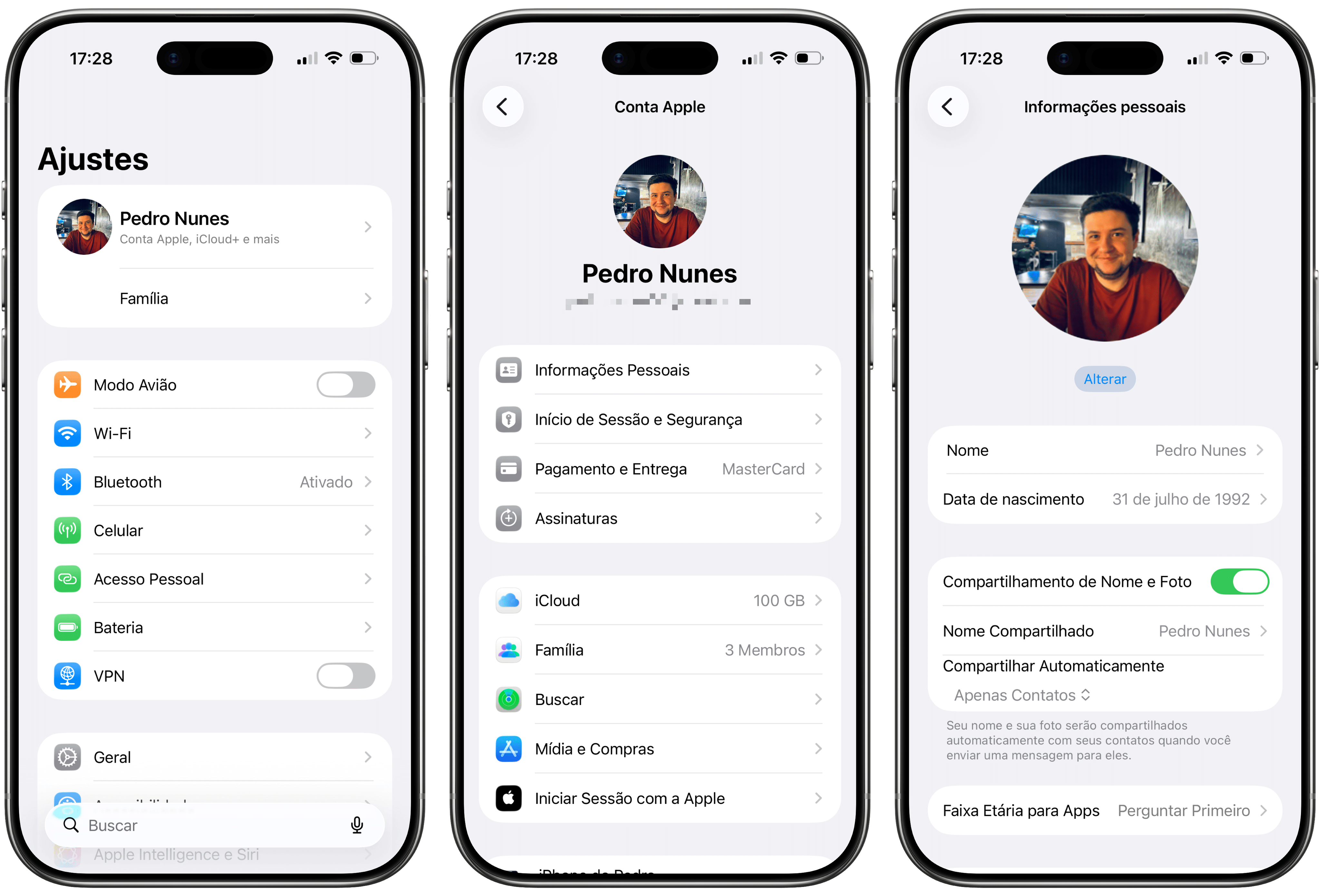 Abra os Ajustes (Settings), toque no seu nome (na parte superior) e vá em “Informações Pessoais”.