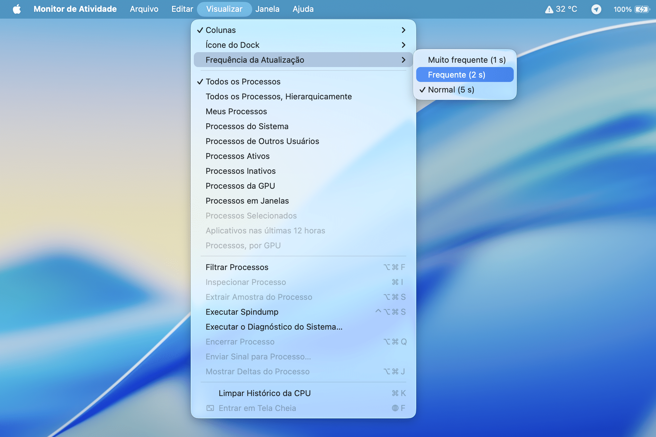 Pedro Henrique Nunes10/06/2025 • 08:00Abra o app Monitor de Atividade e, na barra de menus, clique em Visualizar » Frequência da Atualização.