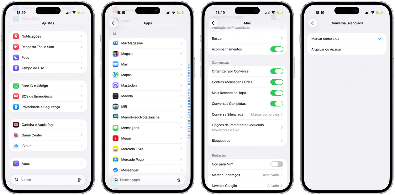 Escolha “Mail” e “Conversa Silenciada” para escolher entre uma das duas opções oferecidas.