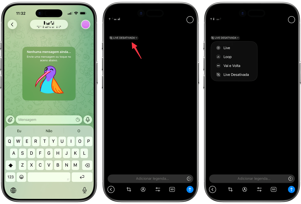 Além de enviar essas mídias no mensageiro instantâneo, você também pode editar o efeito delas, que pode ser “Live”, “Loop”, “Vai e Volta” — ou desativar completamente esse efeito. Veja como escolher! 📸