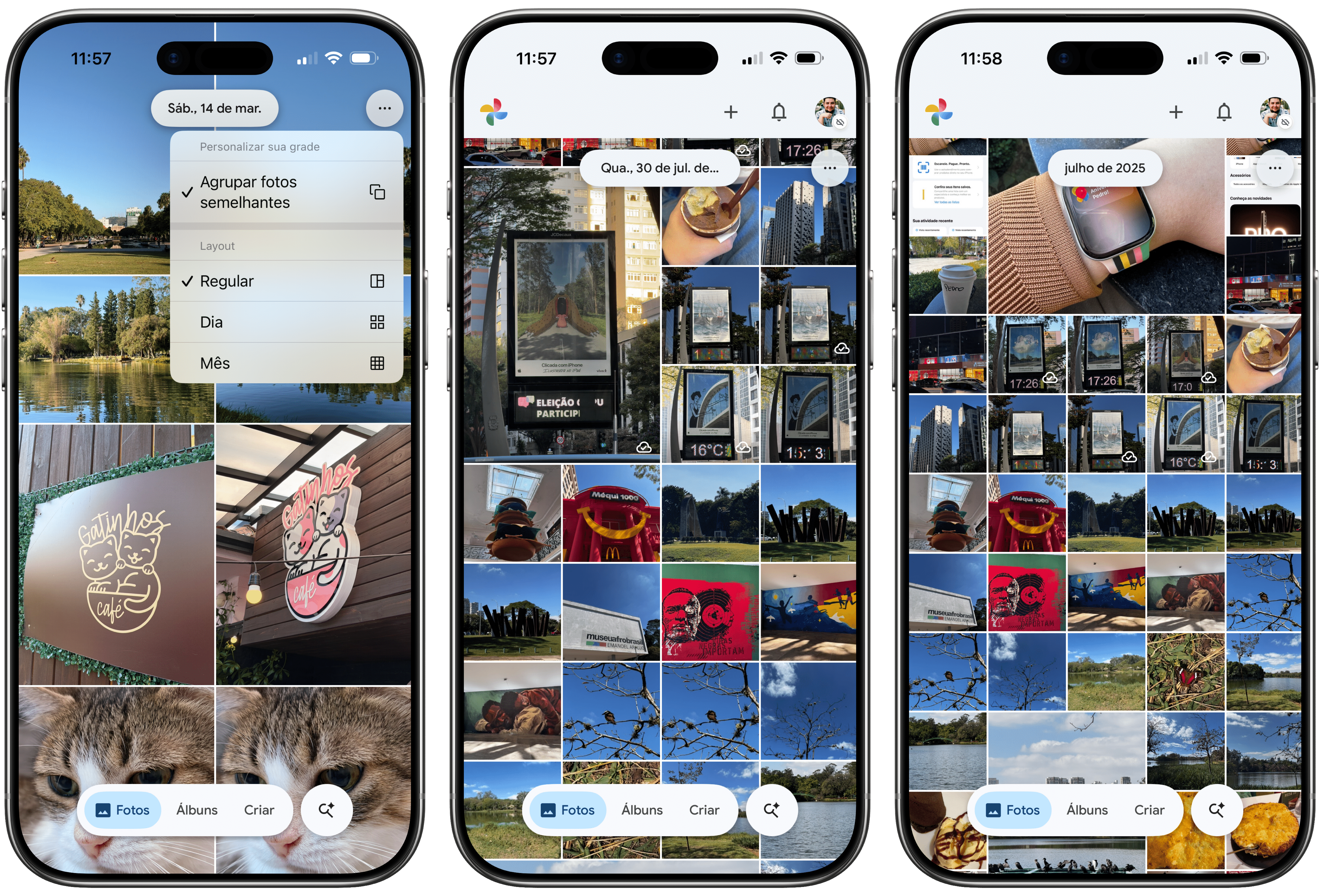 Se quiser, você pode personalizar a sua grade de fotos de forma a exibi-la nos layouts regular, por dia e por mês. Veja, a seguir, como alterar essa visualização facilmente! 📸