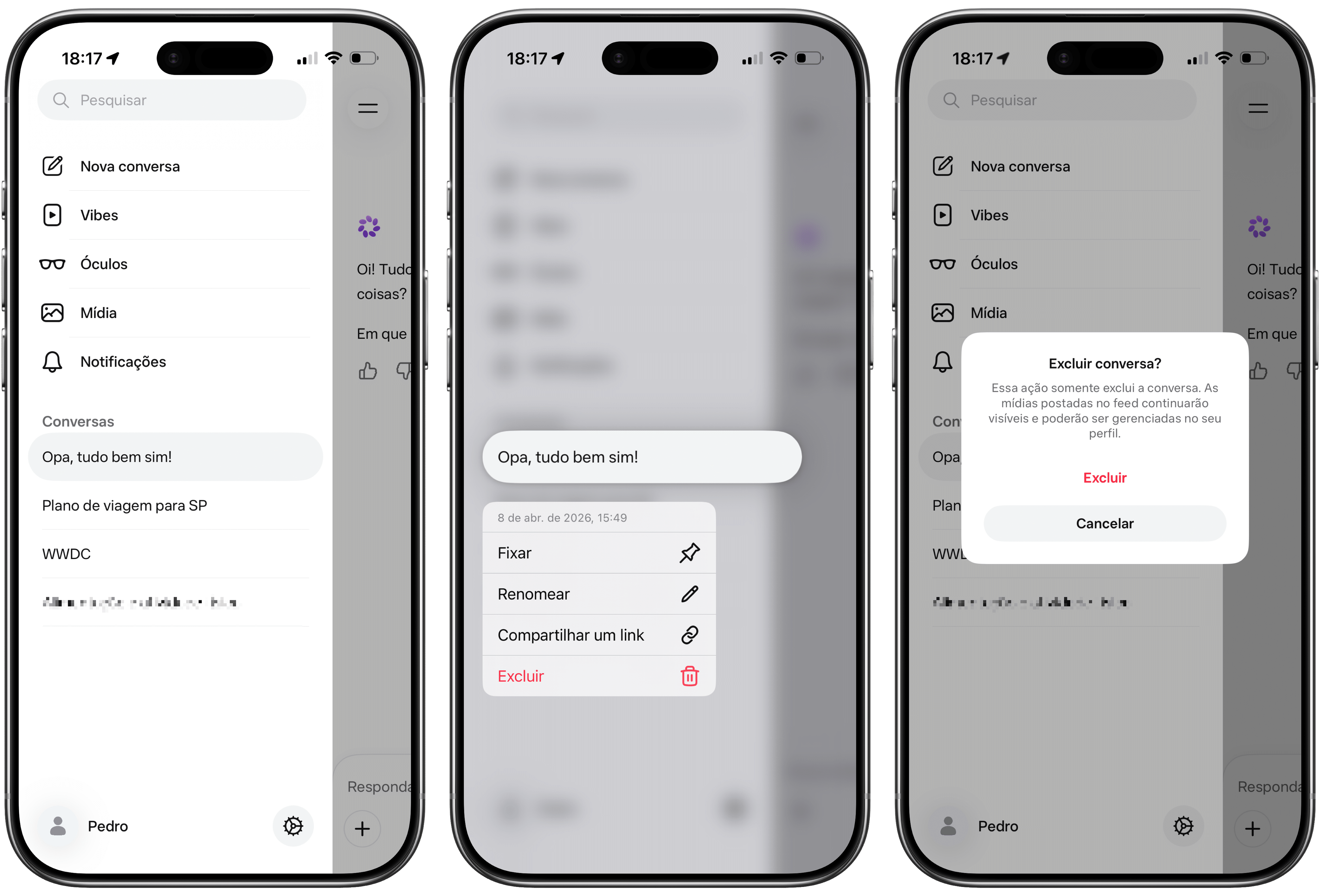 Com o app ou o site aberto, abra a barra lateral e mantenha o dedo pressionado em cima do chat desejado ou passe o cursor sobre ele e clique nos três pontinhos.
