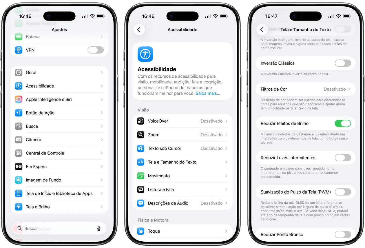 Batizado de Reduzir Efeitos de Brilho (Reduce Bright Effects), ele minimiza os efeitos brilhantes que aparecem quando você interage com certos elementos da interface Liquid Glass, como as letras do teclado, por exemplo.