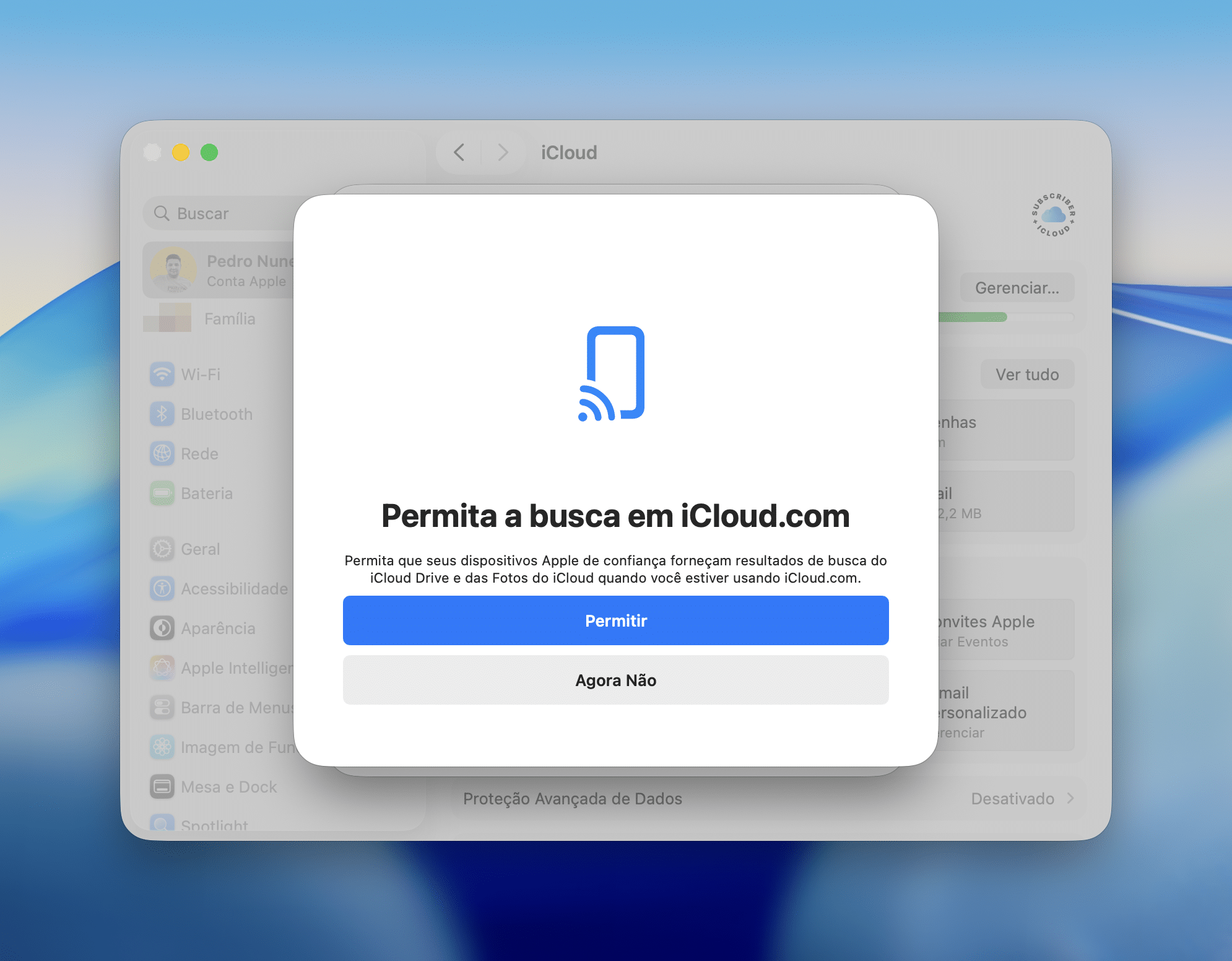 Trata-se da possibilidade de ativar o recurso Permitir Busca (Allow Search), em que você pode usar os seus dispositivos Apple confiáveis para fornecer resultados de busca para o iCloud Drive e o Fotos do iCloud por meio do iCloud.com.