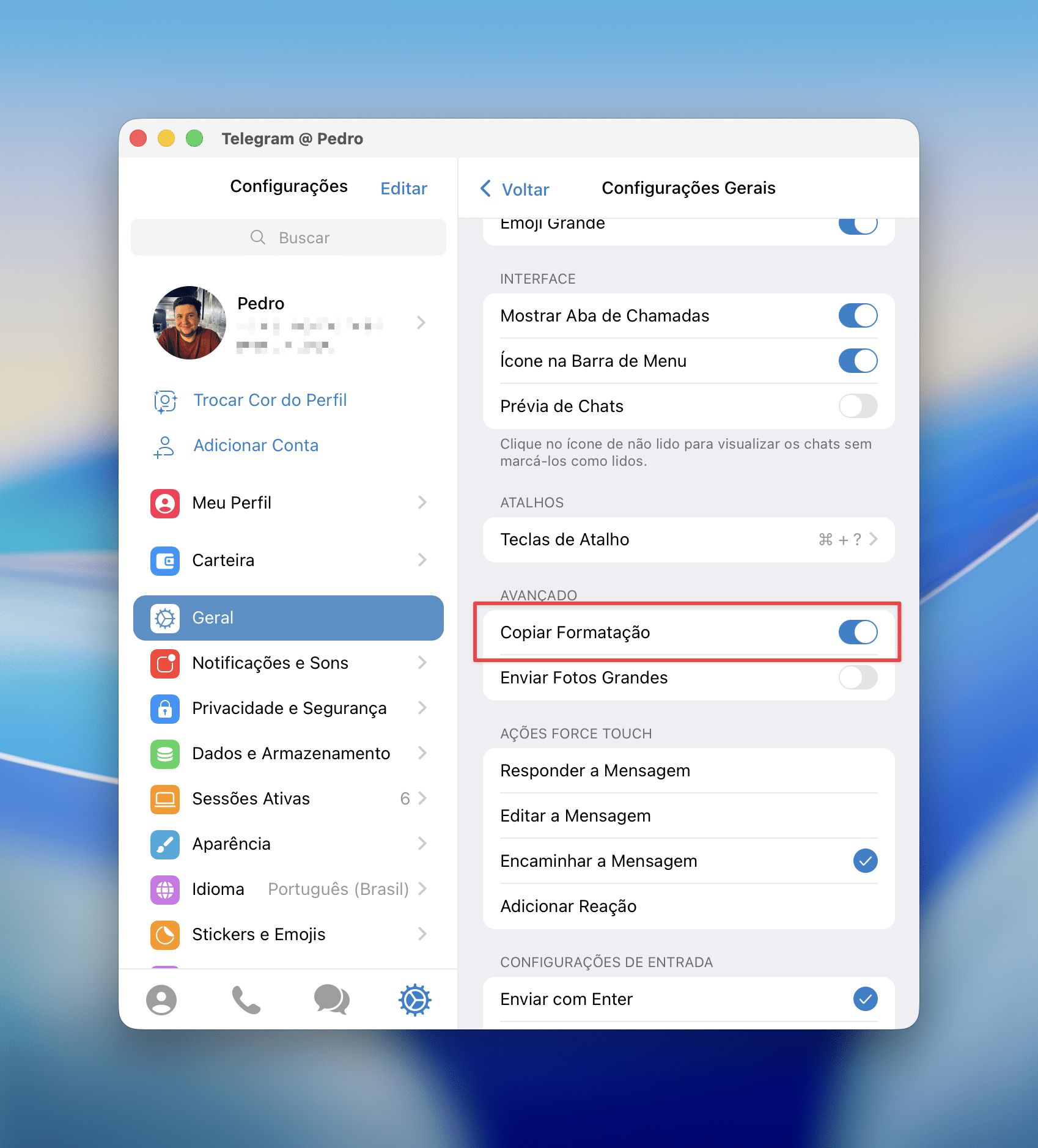 Pedro Henrique Nunes19/02/2026 • 07:30Com o app aberto, vá até Telegram » Preferências…, na barra de menus, ou utilize o atalho ⌘ command ,. Se preferir, basta clicar na aba representada por uma engrenagem.