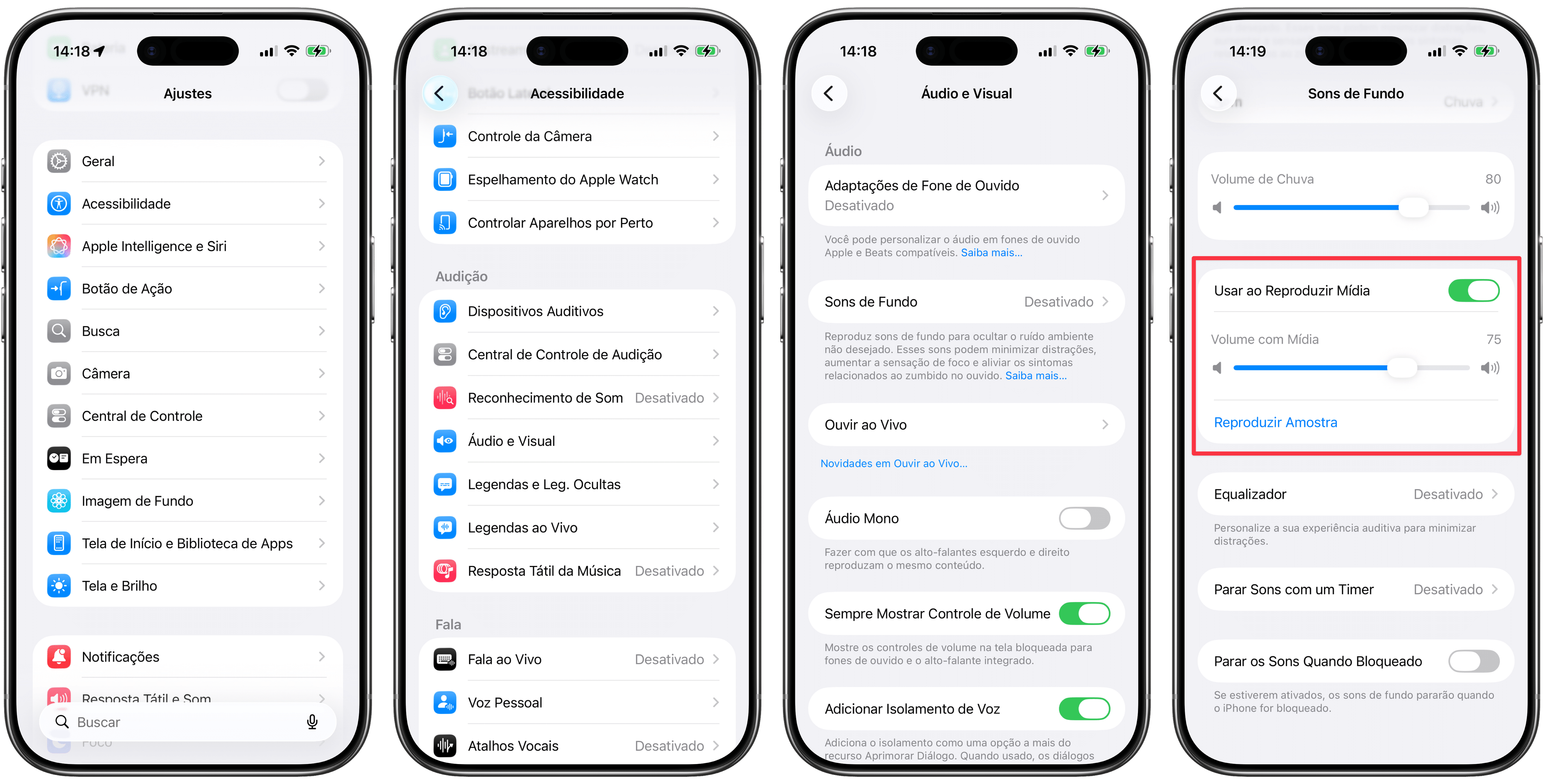 Pedro Henrique Nunes12/11/2025 • 08:00Abra os Ajustes (Settings), toque em “Acessibilidade” e vá em “Áudio e Visual”. Escolha “Sons de Fundo” e marque ou desmarque “Usar ao Reproduzir Mídia”.