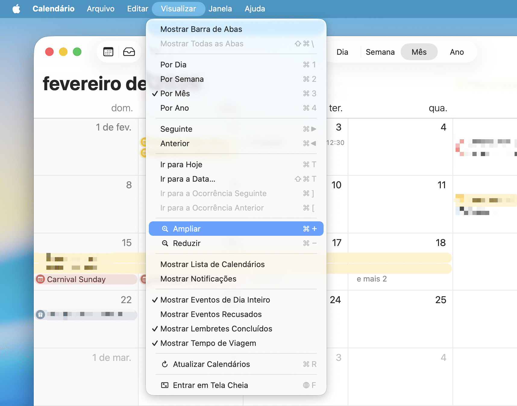 - Na barra de menus, vá até Calendário » Visualizar e alterne entre “Ampliar” ou “Reduzir”.
