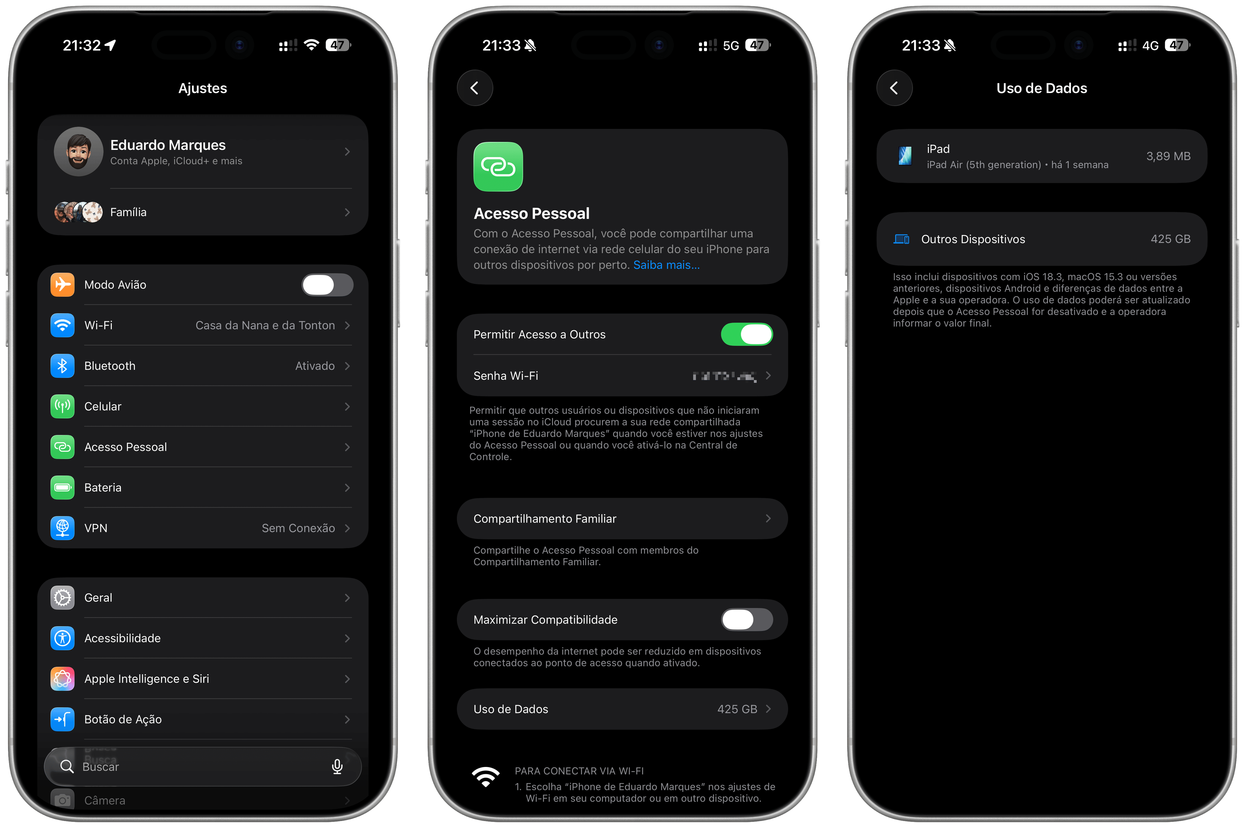 Você pode conferir uma lista de dispositivos que utilizaram o Acesso Pessoal do seu iPhone, contendo o nome e o modelo do produto. Vale ressaltar que devices da Apple mais antigos — ou aparelhos Android — acumulam um valor único no campo “Outros Dispositivos”, diferentemente dos MacBooks e iPads mais recentes.